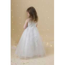 Beautiful white First Holy Communion dress with satin top with a sparkly floral embroidery on bodice with a shimmery tulle skirt with same design as top embroidery decorating its way down top part of skirt. The dress is sleeveless.